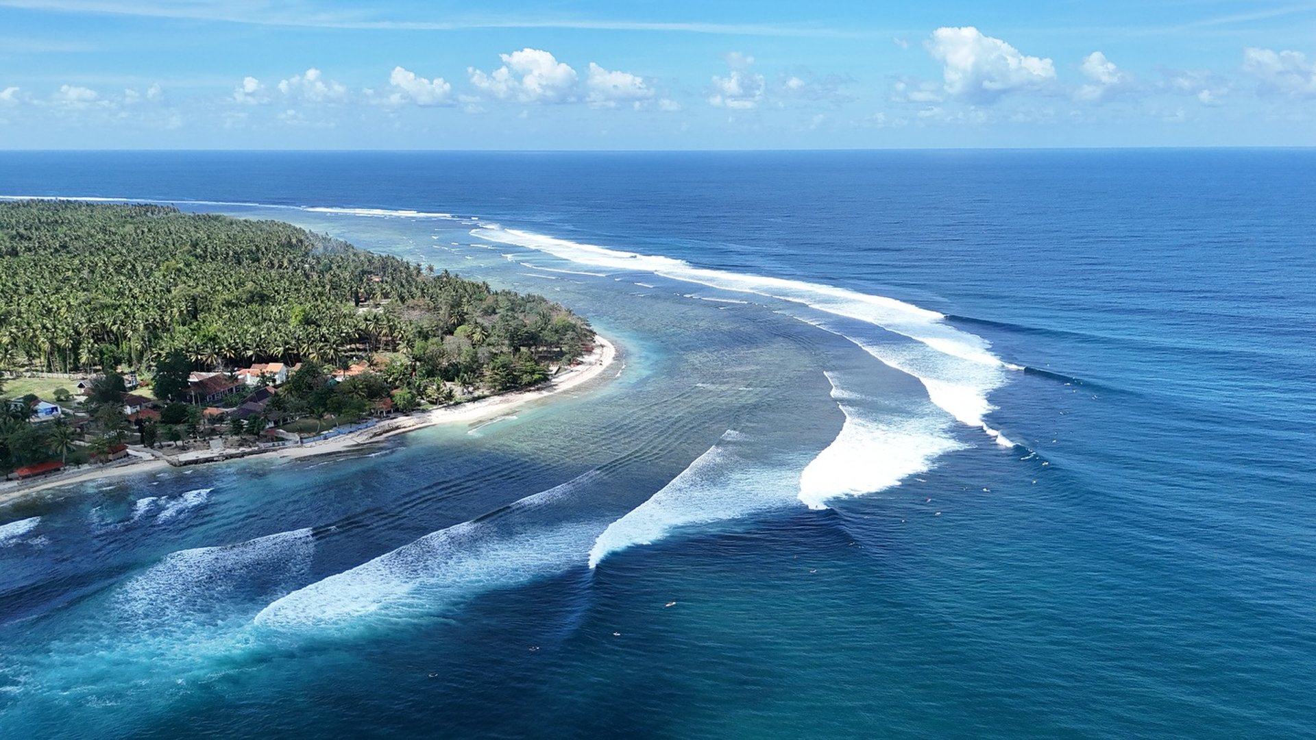 Getting there is part of the adventure: fly into Bandar Lampung, then take a scenic 6–7 hour coastal drive through rice fields, jungle, and small fishing towns until the road meets the ocean. Once you see that first clean line breaking across the reef, you know you’ve arrived.